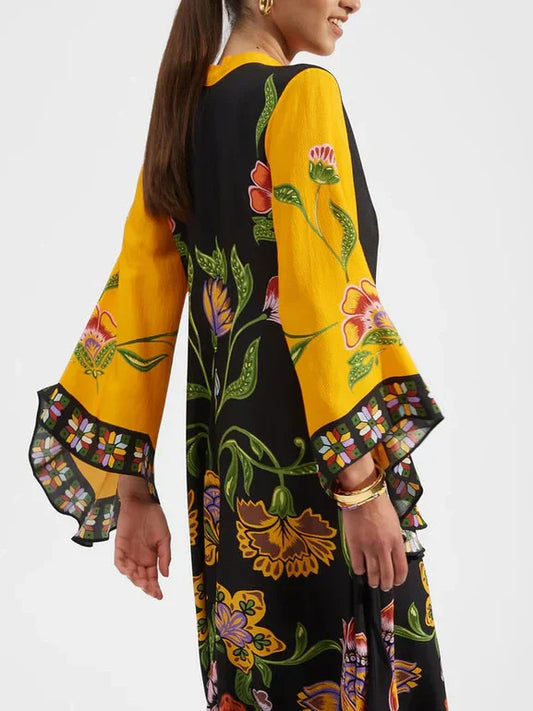 Jasmine Linen Blend Floral Polka Dot Wide Sleeve Shirt Maxi Dress